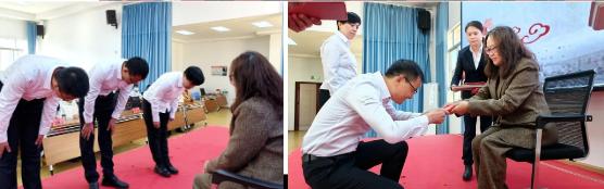 “中医传统拜师礼”承载着中医药文化教育的魂脉,我院针灸科主任赵兴富主治医师、推拿科张竞翔医生以及大理州中医医院针灸科王静副主任医师向施静教授呈递拜师帖、行拜师礼、奉茶献花,仪式简单庄重,“一鞠、一拜、一盏茶”深深表达了弟子对老师的敬重之意,表明自己虚心求学、尊师重道,献身中医事业的信心和决心;师傅向弟子赠予回徒帖,勉励弟子刻苦勤学,弘扬国粹,真正成为“知行合一、守正创新”的中医药人才。