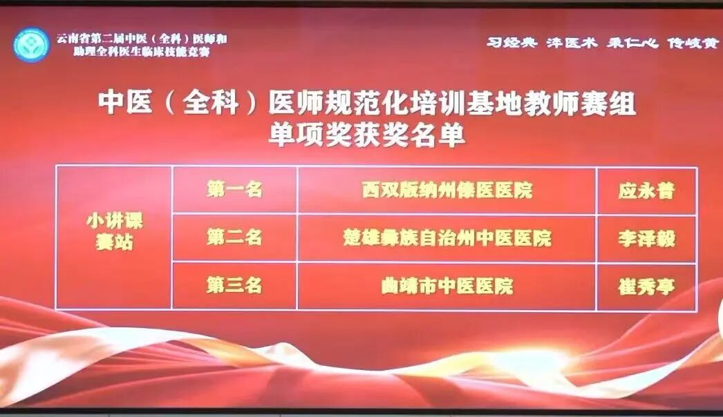 在规培技能大赛中,西双版纳州傣医医院教师组的应永普老师在小讲课环节脱颖而出,以清晰的讲解思路、生动的教学方法和专业的知识素养,荣获中医(全科)医师规范化培训基地教师赛组单项奖第一名的优异成绩。教师团队展现出了深厚的教学功底和丰富的临床经验,获得教师团体优秀奖; 学员团队也凭借默契的配合、出色的发挥,荣获中医(全科)医师规范化培训基地学员赛组团体优秀奖。