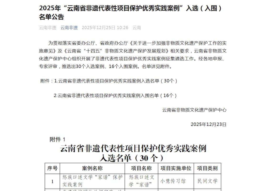 本次评选是省非遗保护中心为贯彻落实我省关于加强非遗保护工作的部署要求而开展的一项重要工作,经严格申报与评审,最终推选出30个具有示范意义的优秀案例,于2025年12月25日在“云南非遗”官方公众号平台正式发布推介。